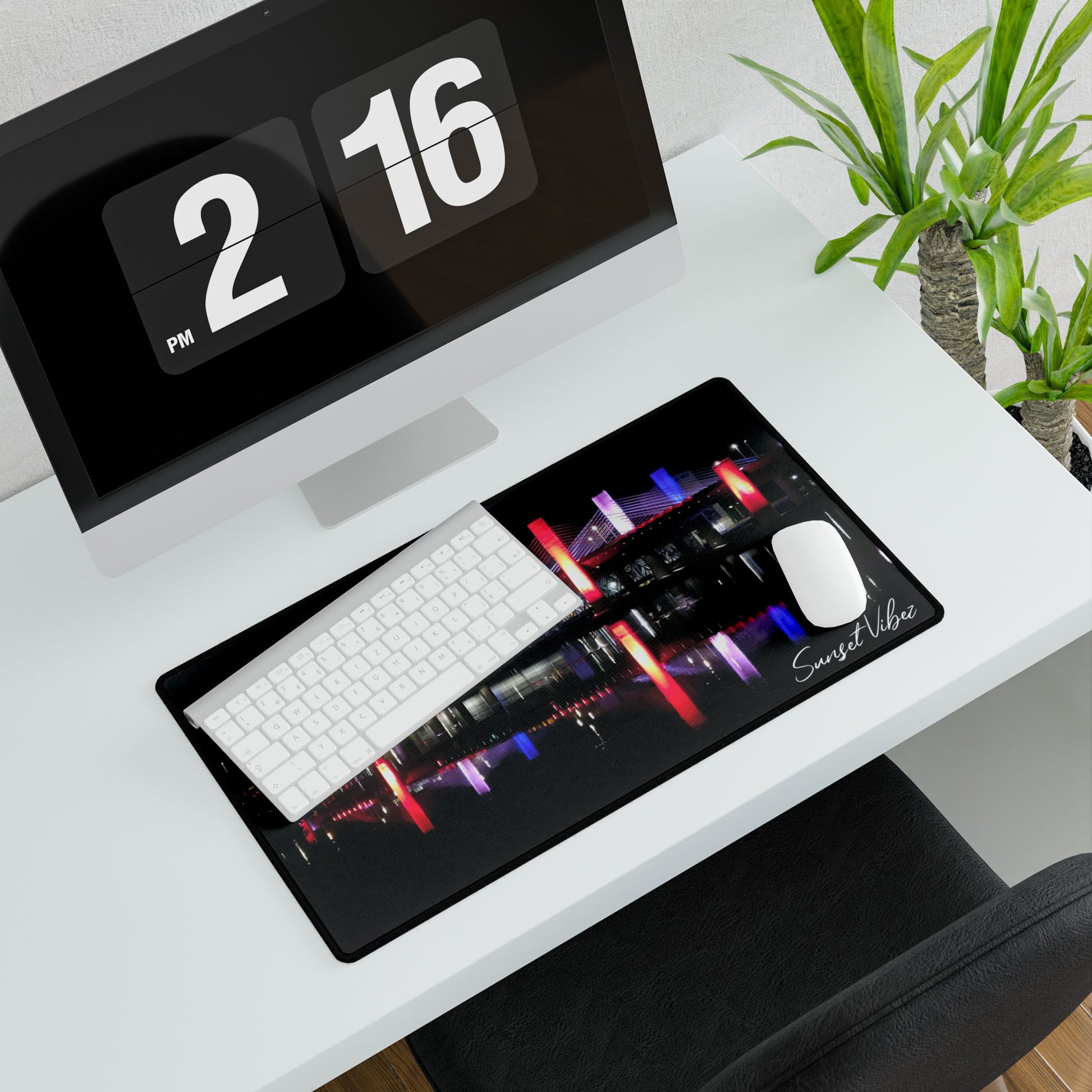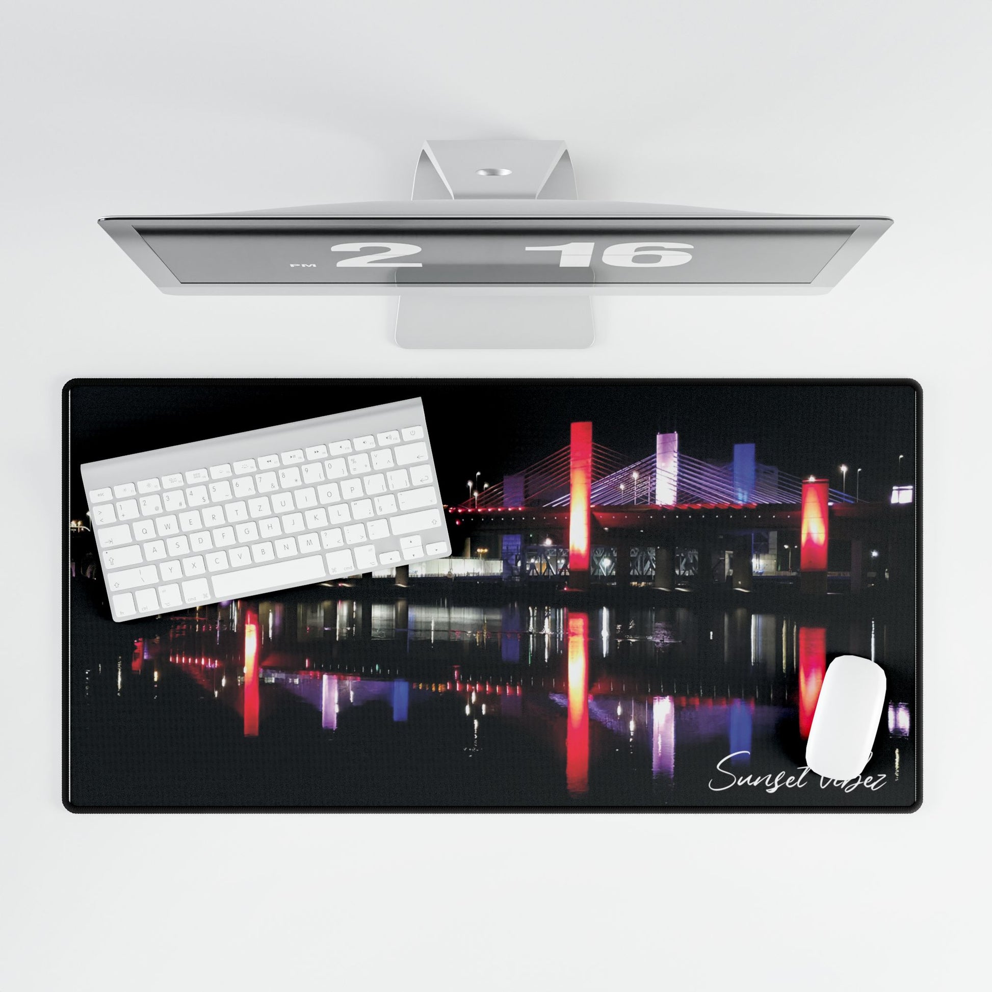 Spread across your desk like a little nightscape, this desk mat brings city-lights tranquility to long work sessions and late-night setups. The glossy, high-definition print captures vivid reflections of illuminated bridge columns and water, turning a plain workspace into a calm, focused scene. The smooth polyester top gives mice effortless glide while the natural rubber base stays planted during intense scrolling and precise clicks. Choose from three sizes to anchor your keyboard and mouse, or create a layered setup that feels thoughtfully curated. Built with anti-fray edges and a sewn label, it’s made to handle daily use without losing its color or edge.